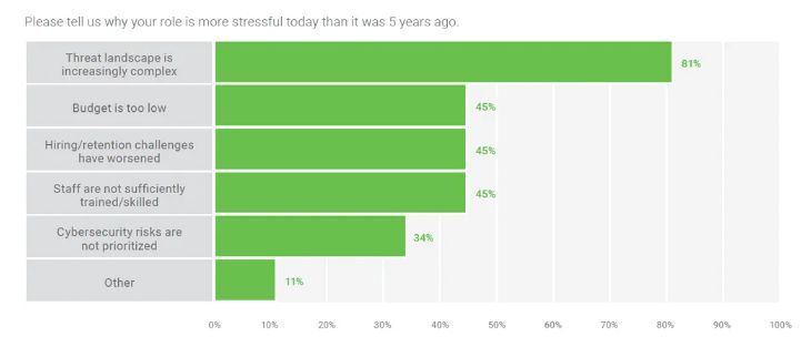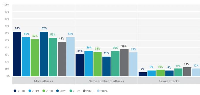 Опрос 1800 австралийских экспертов в сфере кибер безопасности показал, что 64% из них считают, что их работа последнее время становится более напряженной (см. "Australian Cybersecurity Professionals Confess To Growing Job Stress", Ben Abbott, October 7, 2024). Это объясняется увеличением числа различных угроз, сложная ситуация с бюджетом и ограничениями людских ресурсов. Число же различных угроз увеличивается. На рис. 51 представлены результаты опроса.