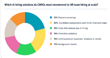 Обсуждается пробллема поиска CHRO (Chief Human Resources Officers) кадров нужной квалификации в свете стремительного развития современных технологий (см. "CHRO Insights: Driving Solutions for the Workforce of Tomorrow", Checkr Report, 2025). Обзор основан на опросе около 500 CHRO. Для решения этих задач все чаще привлекаются средства ИИ. На рис 98 показано распределение используемых средств ИИ.
